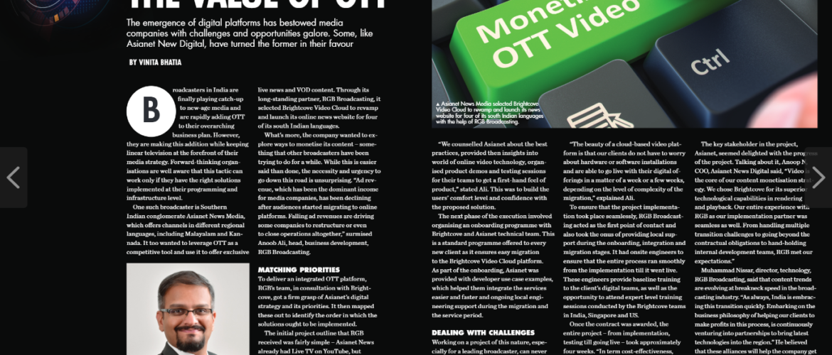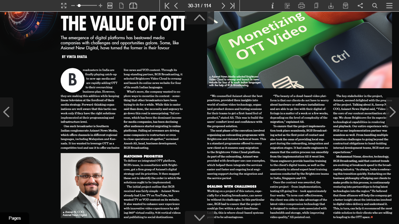 “Asianet News Network is positioned as South India’s leading Multilingual Video News and Entertainment destination (www.asianetnews.com). Video forms the core of our content monetisation strategy. We chose to partner with Brightcove as an end-to-end video platform for its superior technology capabilities in rendering and playback. Our entire experience with RGB – implementation partner was seamless as well. From handling multiple transition challenges to going beyond the contractual obligations to hand-hold internal development teams, the team at RGB met our expectations” – Anoop N, COO – Asianet News Digital